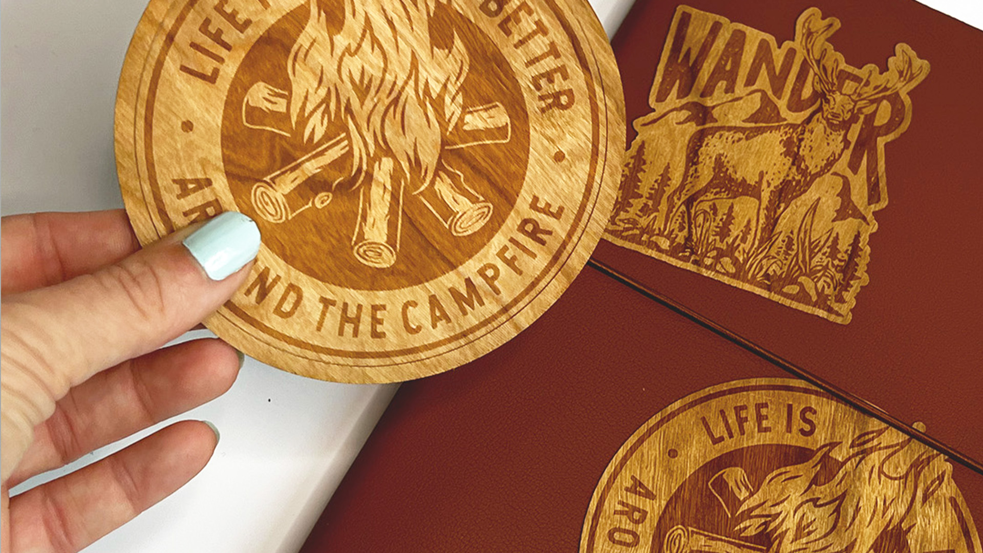 - Seasonal storytelling — fall leaves, pumpkins, mountain ranges, and earthy logos look incredible when engraved into wood.